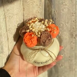 Μπουκέτο φτιαγμένο στο χέρι από 100% φυσικό κερί σόγιας, με λουλουδάκια από κερί στην επιφάνεια — τα οποία μπορείτε να αφαιρέσετε και να χρησιμοποιήσετε ως wax melts.